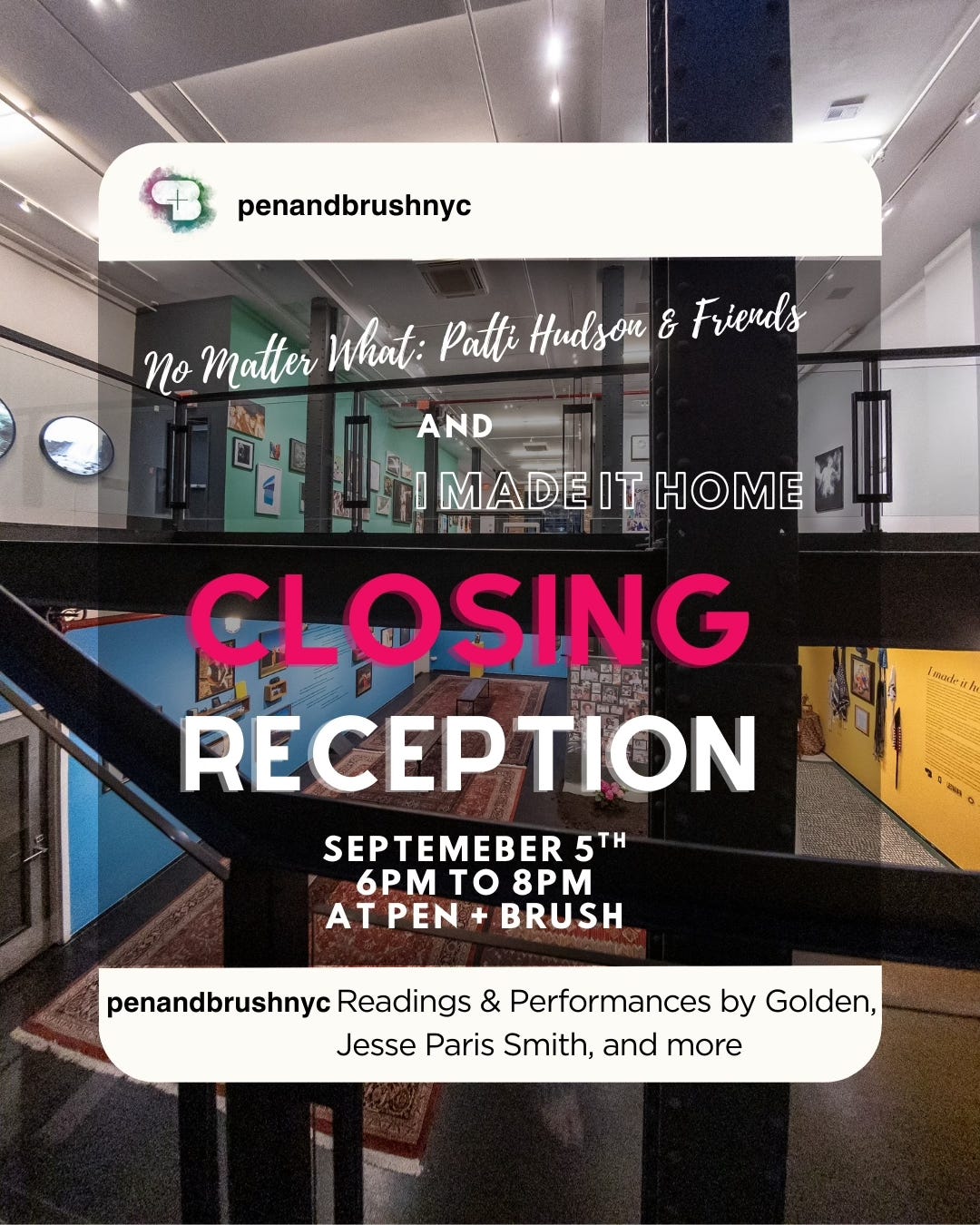 Additionally, we will also have a closing reception event on September 5th which will include a performance by Golden, whose powerful solo exhibit, I made it home, is in the downstairs gallery at Pen & Brush. Here is info about that event and a place to RSVP.